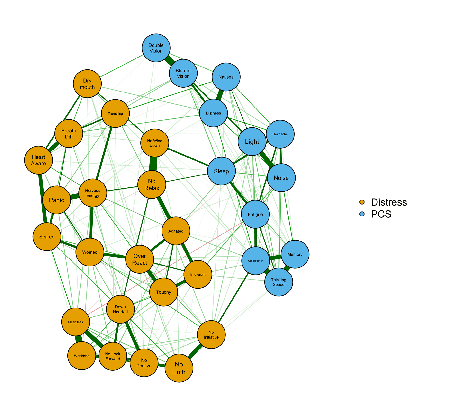 In this study we examined how post-concussion symptoms (PCS) and psychological distress interact in people recovering from mild traumatic brain injury (mTBI) using network analysis. In a sample of 436 adults with mTBI, the analysis revealed two key bridging connections: (1) sleep disturbances linking to stress-related hyperarousal (difficulties winding down/relaxing), and (2) concentration difficulties linking to depressive symptoms of low initiation. These symptoms appeared central in connecting PCS and psychological distress, suggesting they may be critical treatment targets.